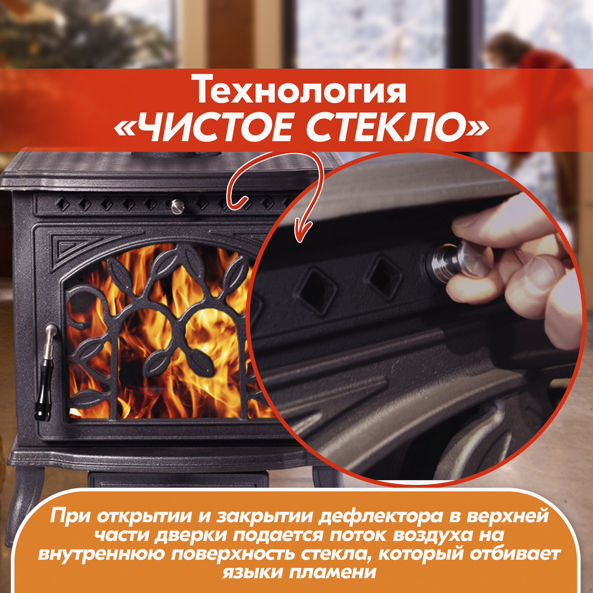 Боковые стенки и дверца печи-камина оформлены большими окнами из огнеупорного стекла, дополненными цветочным узором из чугуна.