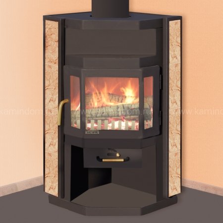Каминная модель Нева – это угловая печь-камин компании Мета, успешно сочетает в себе эффективность, технологичность и небольшую цену. Несмотря на свои небольшие габариты и вес, может отапливать до 60 квадратных метров жилого помещения. Эта печь изготовлена из жаростойкой стали, с последующим покрытием поверхности термостойкой краской. Все топки печей Мета футеруются изнутри шамотом – керамической плиткой, выдерживающей высокие температуры. Это позволяет не только увеличить их долговечность, но и улучшить характеристики процесса горения. Боковые поверхности угловой печи-камина облицованы керамикой, способной аккумулировать тепло. Кроме того, печь-камин Нева имеет открытую полку для дров и выдвижной зольный ящик. Цена печи делает эту угловую печь камин особенно доступной. качестве топлива используются сухие дрова или брикеты бурого угля. Категорически запрещается применение каменного угля и его производных.