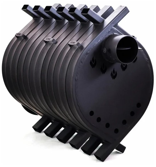 В конструкции данной печи также увеличена поверхность теплоотдачи и решена проблема интенсивного инфракрасного излучения при номинальной мощности ее эксплуатации. Холодный воздух, из отапливаемого помещения, за счет конвекции поступает в нижние отверстия теплообменных труб, а через верхние возвращается в помещение нагретым до температуры от 60 до 80 градусов.Таким образом, воздух равномерно нагревается и перемешивается по всему объему помещения.